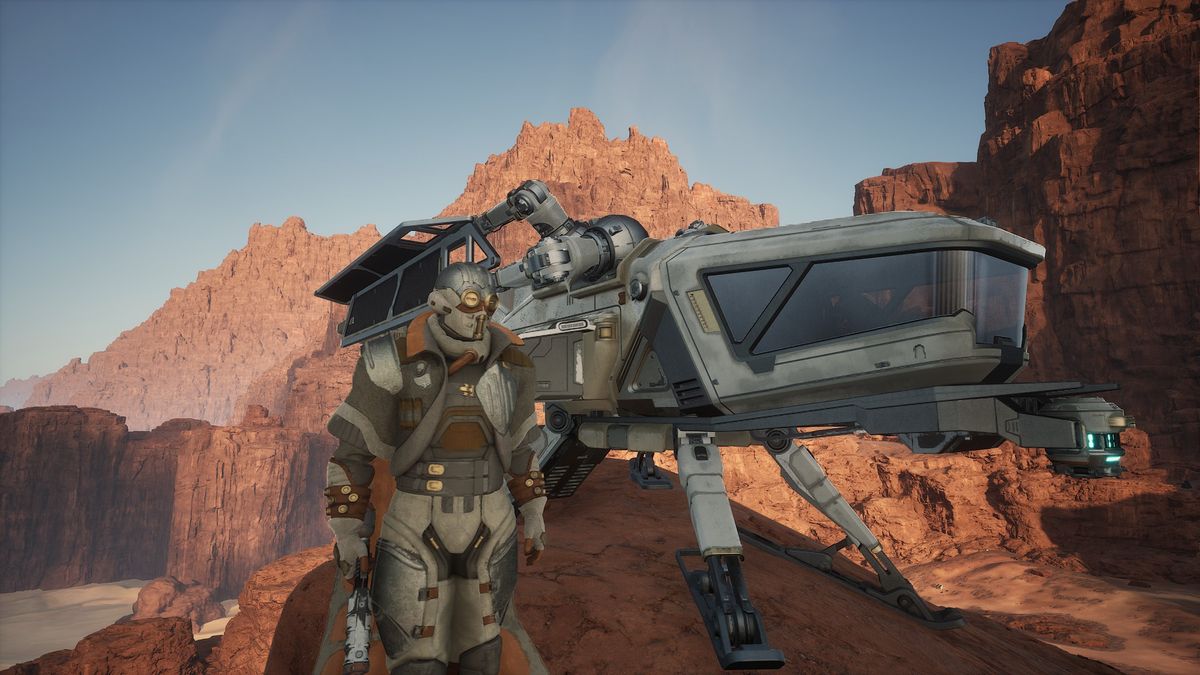 But there’s also the kind of grind I really enjoy. I love hopping in a buggy and driving out for a resource run, using a mining laser to extract minerals from boulders in the mountains or crystals in the murky ravines. I’m always happy to fly my ‘thopter out to the dunes to collect a resource called flour sand, dodging the angry sandworms that show up every few minutes.