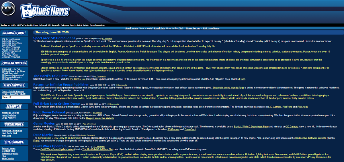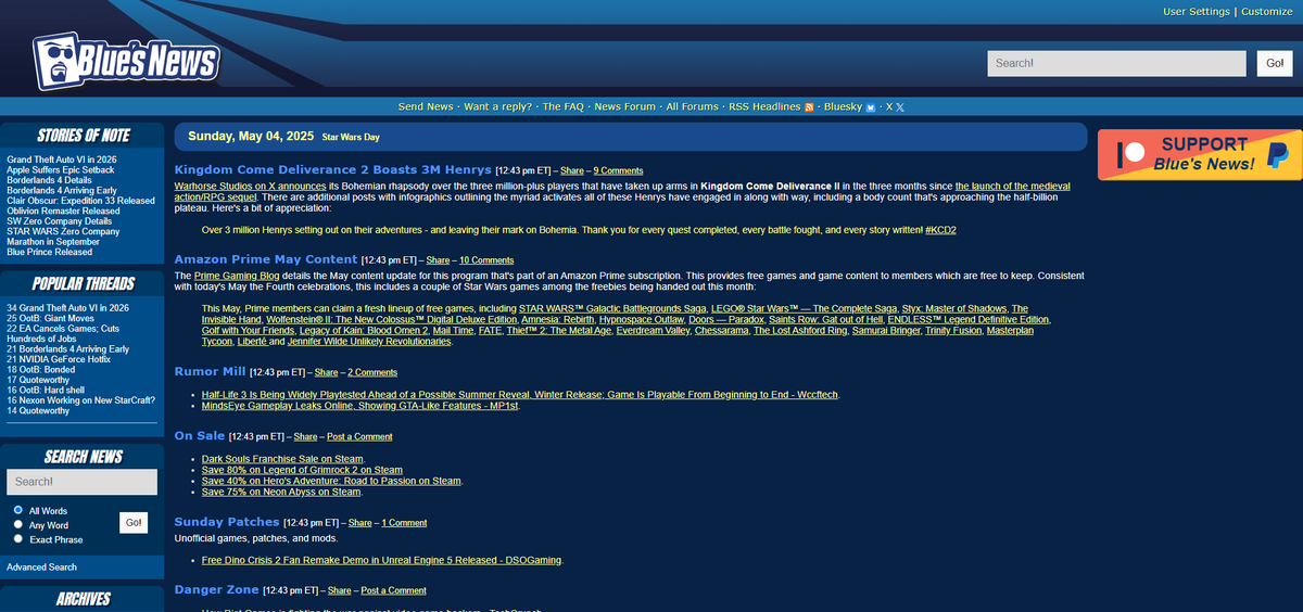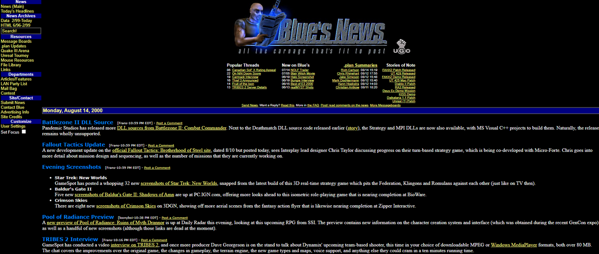 That impulse came and went in 1996, but nearly 30 years later, Blue’s News persists as a general PC gaming and tech outlet with minimal changes since its inception. Its very layout brings to mind a yellowing Packard Bell CRT, and that’s after the “modern” redesign. You’ll not find so much as a hot take on the site, as it’s an endless stream of concise, neutral news roundups and aggregated headlines. Today, Blue’s social media tagline tracks its response to the shifting media world at its flanks: “No AI slop, no sponsored posts. Sorry, not sorry.”