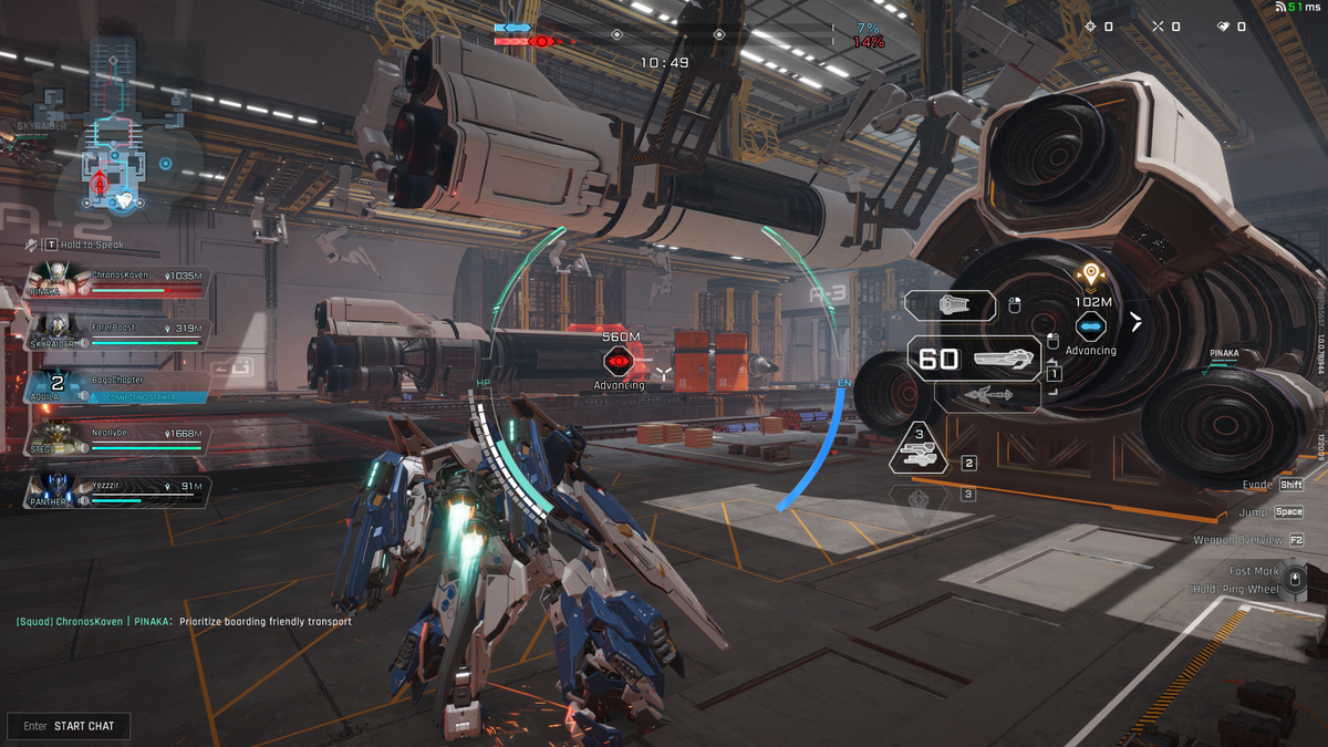 Some mechs, like Welkin, can ram straight into you and ignore your layer of armor to start slashing away your health with energy swords and axes. Most mechs have a way to break away and flee, which gives Mecha Break’s 6v6 matches a much slower pace than most hero shooters. There are snipers with auto-aim and yet you rarely get obliterated out of nowhere. All that extra time opens the door for more tactical plays based around managing your fuel for dodging and floating in the air, and gives space for cinematic duels between two pilots as they dance around each other in a flurry of smoke and rockets.
