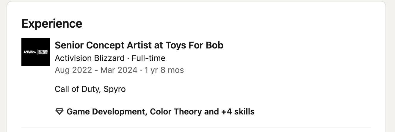 Donald Yatomi has been an artist in the videogame industry for a long time, including a lengthy stint at Bend Studio as Art Director where he shipped Days Gone. On his profile, his lists working at Toys For Bob for 20 months. But the really interesting thing is that during his time there he cites working on “call of duty, spyro.”