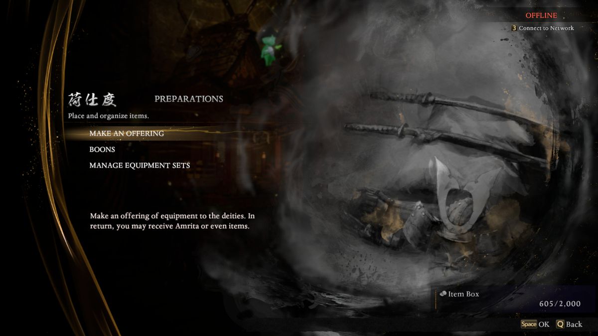 You might’ve noticed that the gear you use gains ‘familiarity’ as you kill enemies—it’s the little progress bar at the top of the item description. This is crucial because the items you’ve got high familiarity with are worth much more Amrita when you use them as an offering at a shrine. You can offer gear to a shrine by selecting ‘Preparations’ and then ‘Make an offering’.