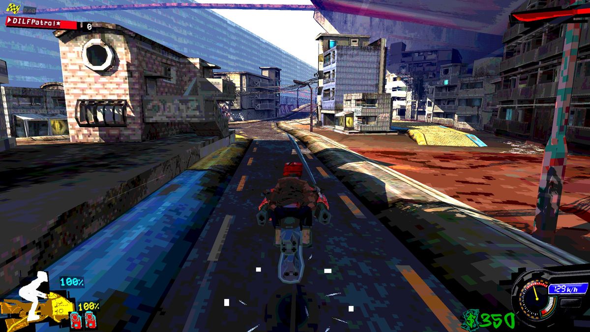 There are weapons and power ups scattered on the track and in the arenas, with a tasty, anarchic variety to the arsenal. I was having trouble doing real work with the guns, but the melee weapons are extremely satisfying. My favorite was a traffic sign you can use as a jousting lance, both on foot and in a vehicle.