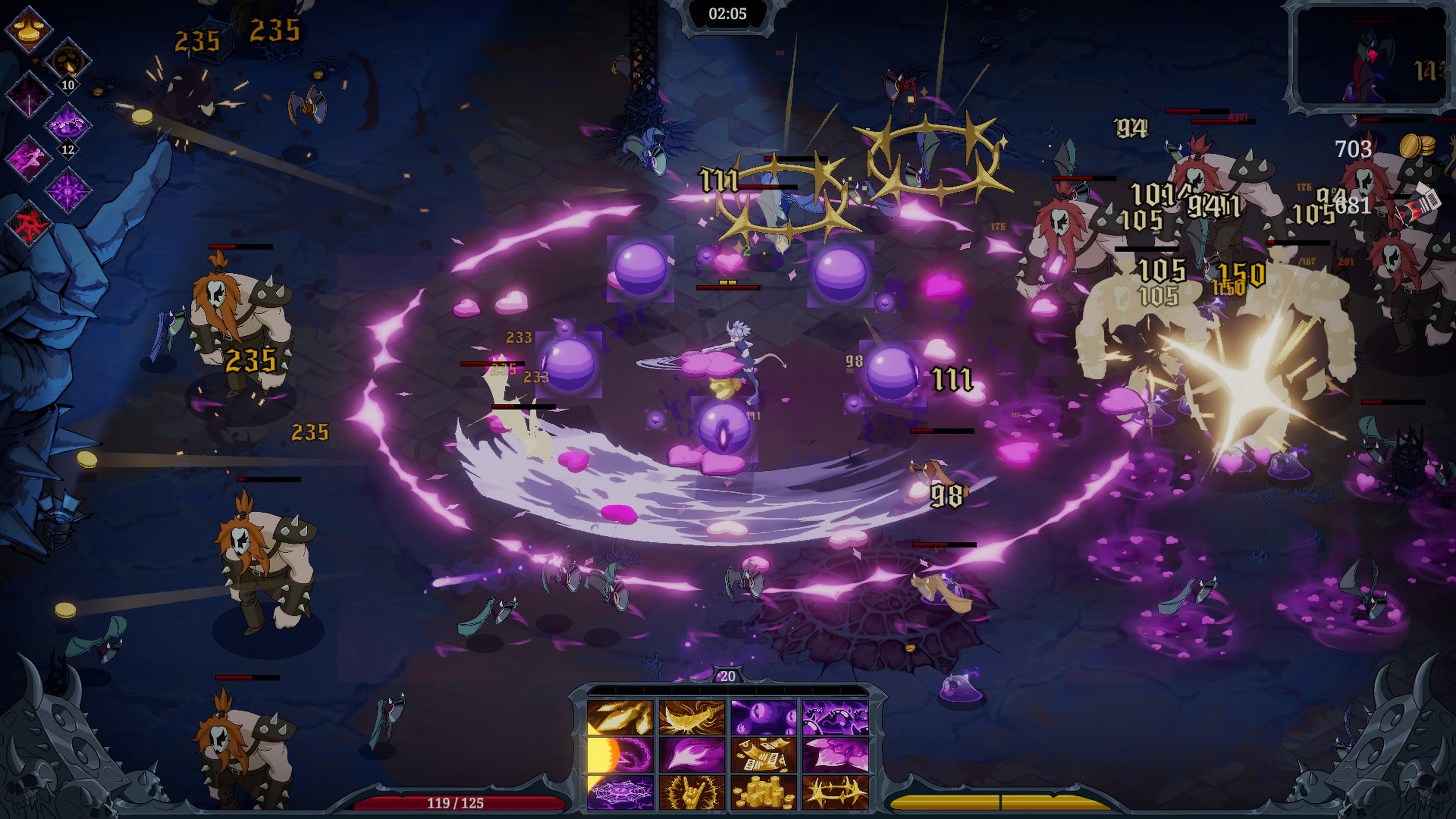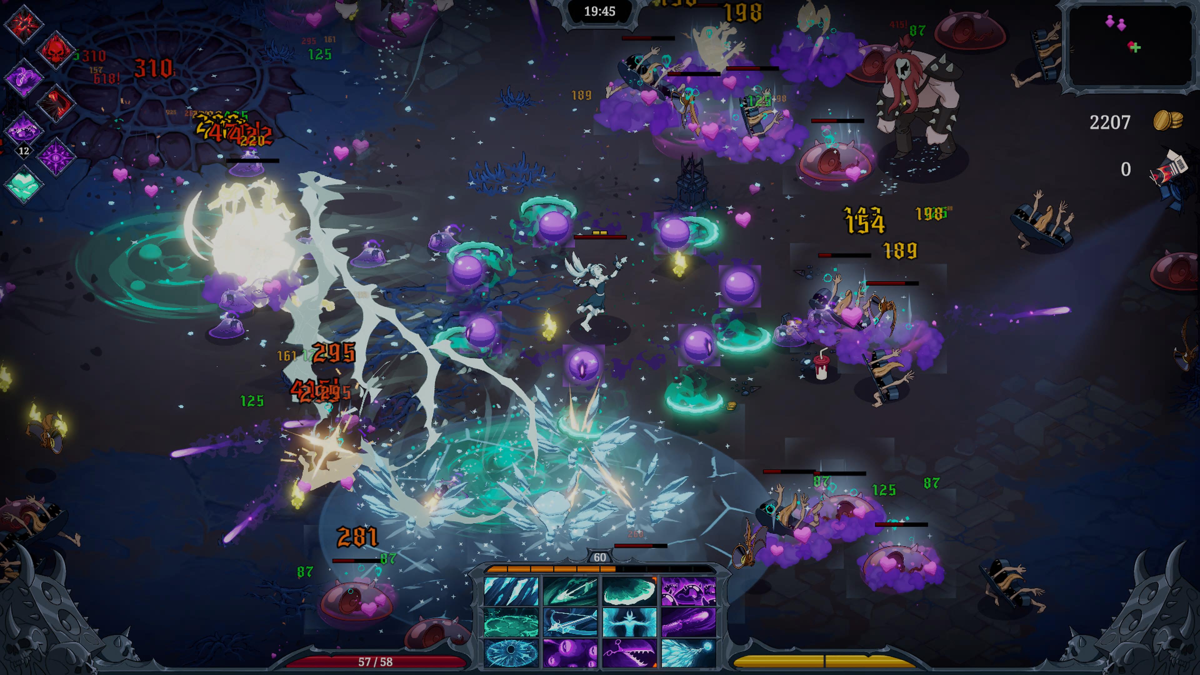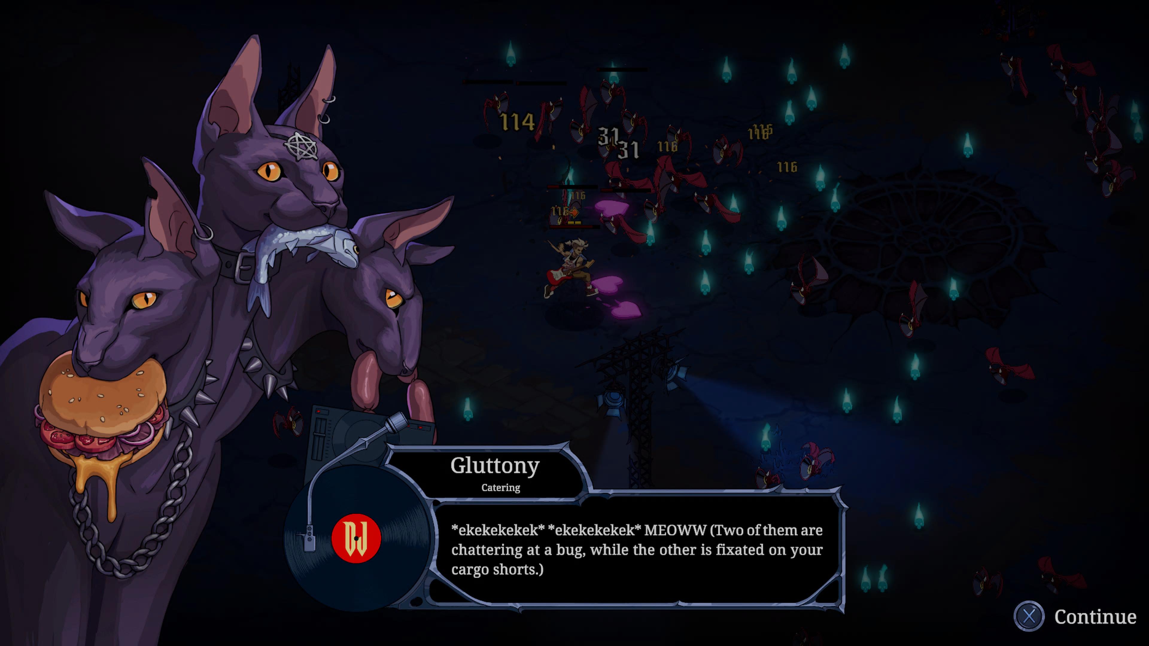 Out on the battlefield, Devil Jam is all about that Vampire Survivors style, the one where almost all your abilities and attacks are fired off automatically. I say almost because there is an option to manually aim your main attack, if you prefer, but otherwise your only controls are running around and performing dashes while hundreds of onscreen enemies attempt to turn you into regular old jam instead of the devil kind.