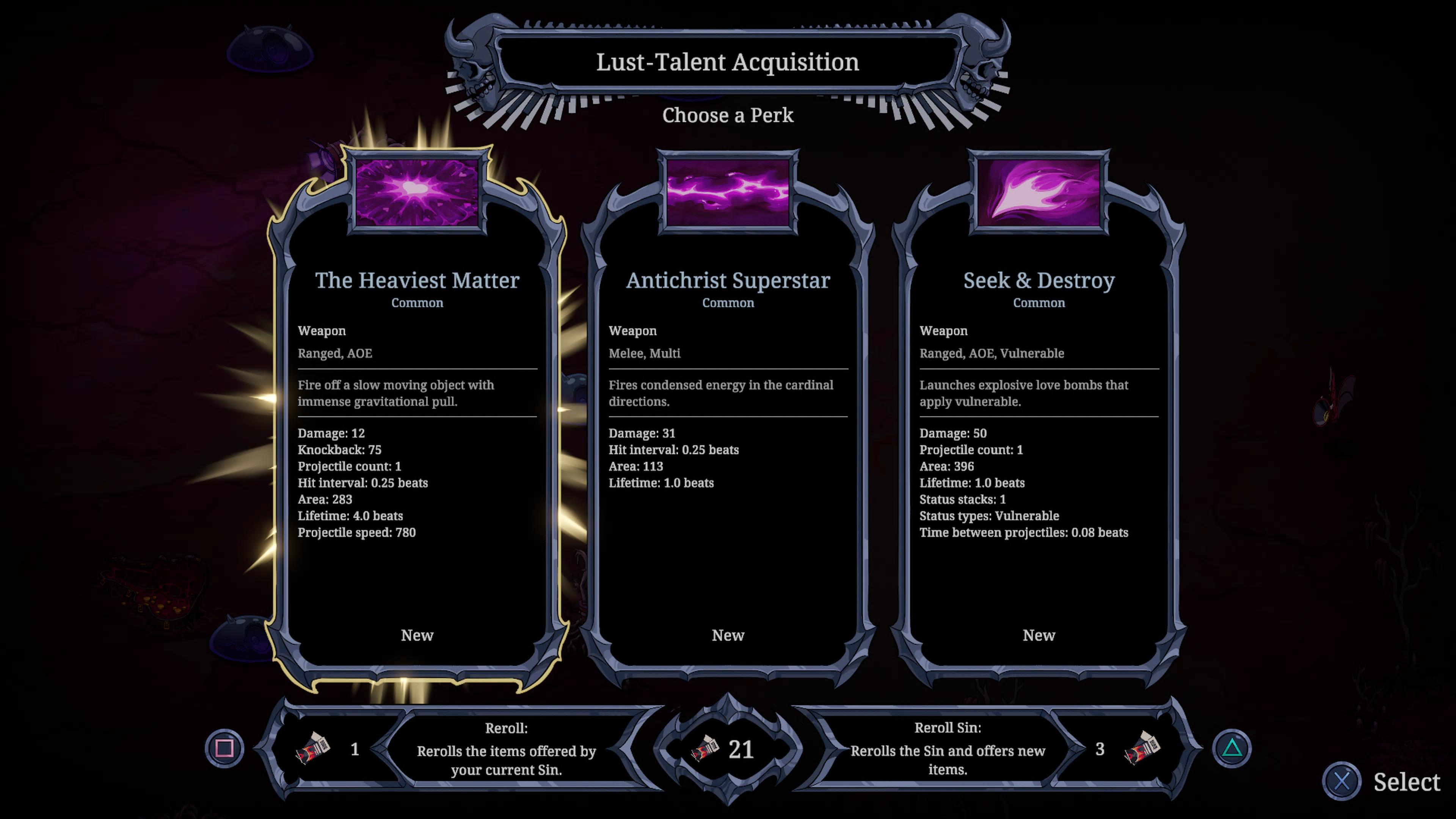 Slaughtering enemies results in XP crystals, and when you have enough to level up, one of the Sins will offer you a few boons to choose from. These range from summoning weird jelly creatures to firing out love bombs to hailstorms of ice shards, or you might get a chance to upgrade one of your existing abilities.