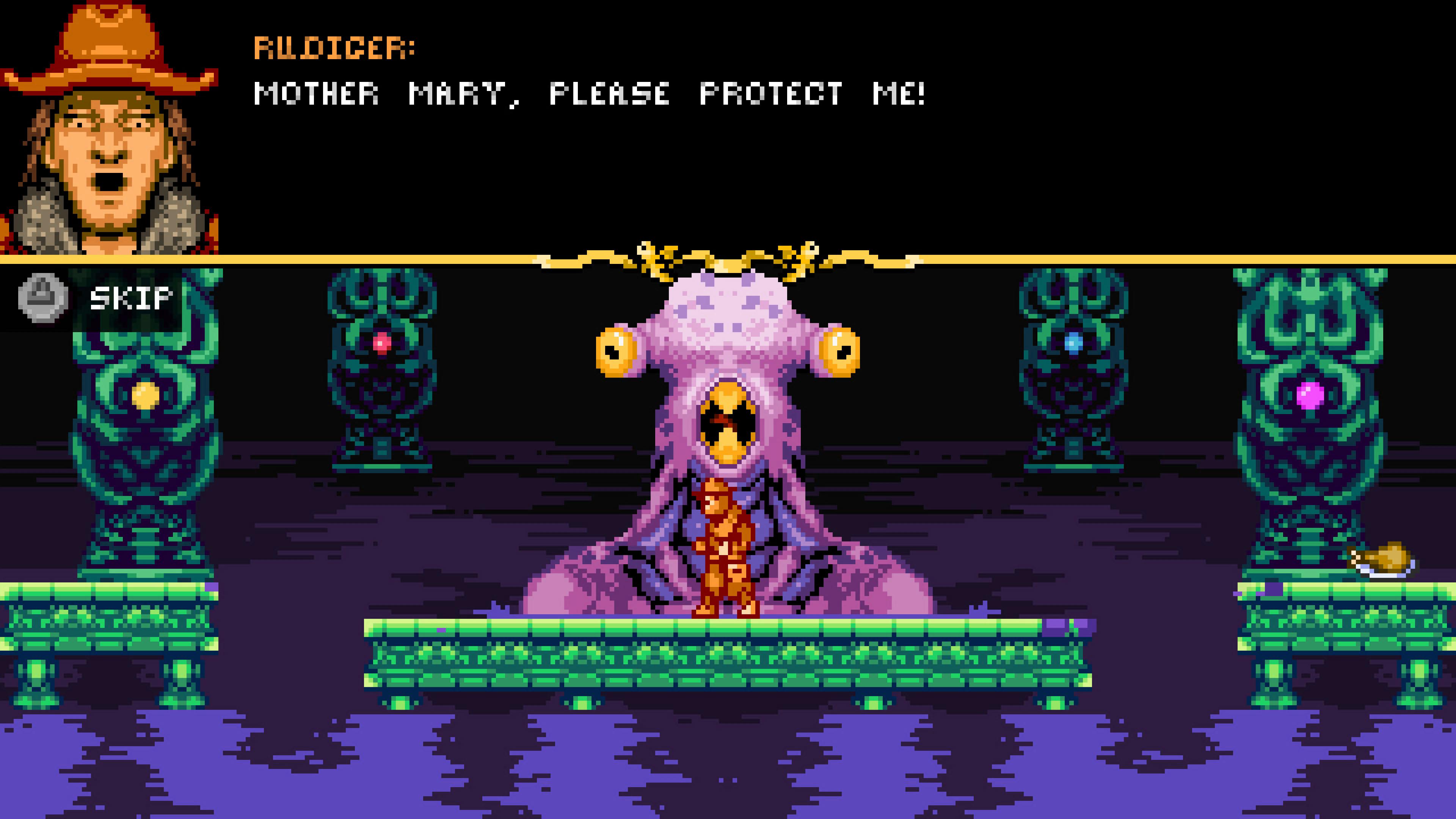 Rudiger has a simple moveset befitting his NES aspirations. He can stab hapless hooligans with his spear, or throw it provided he has enough Rosary Beads. A thrown spear can even be used as a climbing platform, a mechanic that could have been utilised a bit more, I reckon. He also has a DuckTales-style pogo stick bounce, another moment of absurdity. A few later upgrades add extra moves, putting Rudiger in real danger of becoming a competent human being.